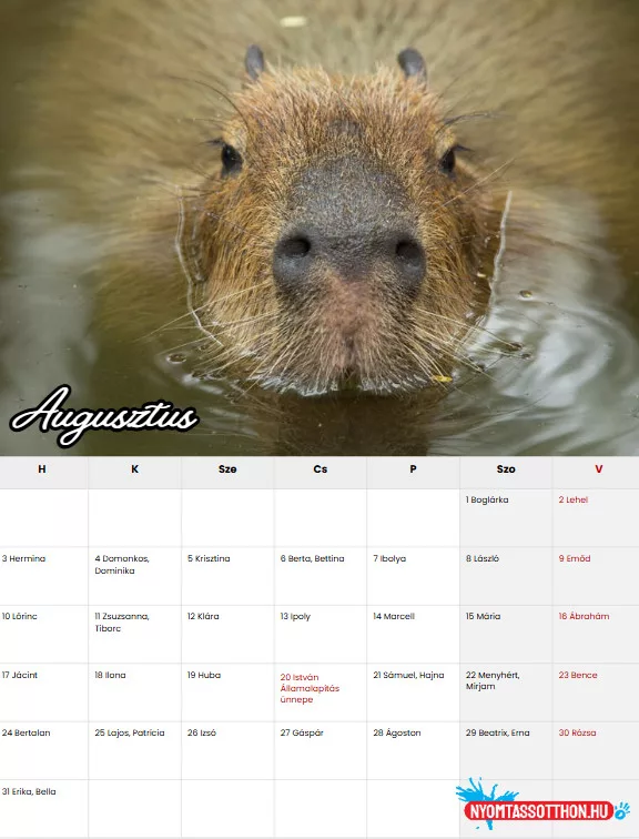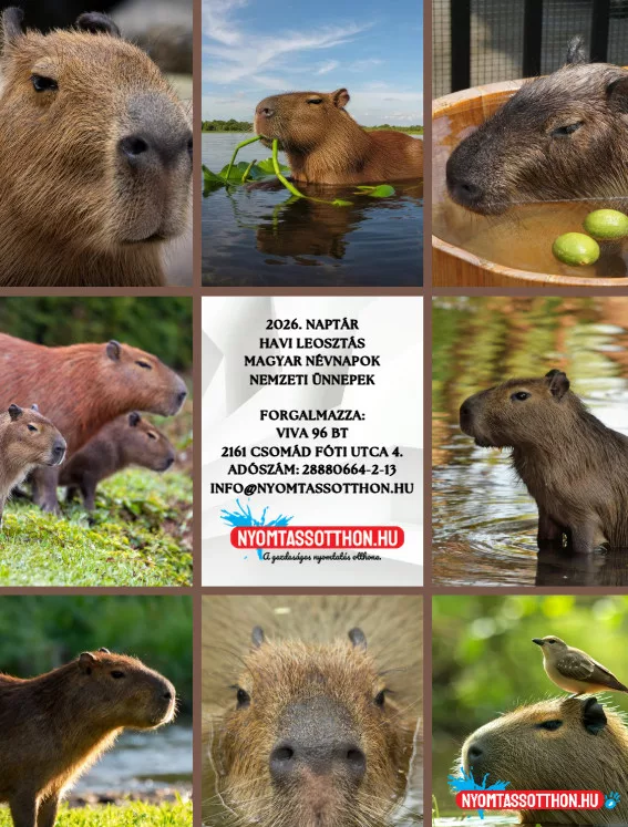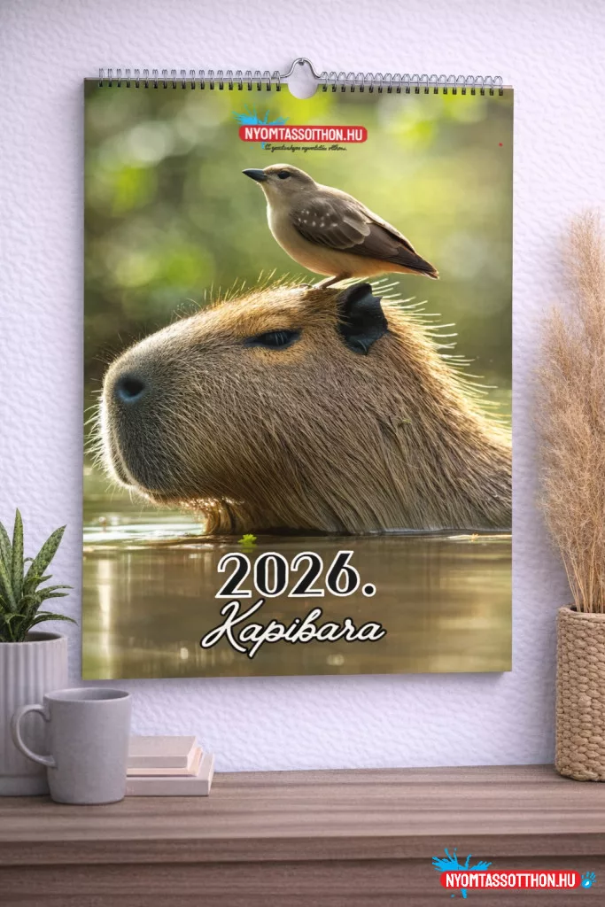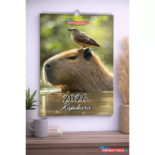 A 2026-os Kapibara fali naptár egy különleges hangulatú, A4 méretű falinaptár, amely a kapibarák nyugodt, derűs és kiegyensúlyozott világát hozza el a mindennapokba. A naptár minden hónapja egy-egy hangulatos kapibara-fotóval vagy illusztrációval jelenik meg, amelyek a természet közelségét, a lassulás örömét és a nyugalmat sugározzák.