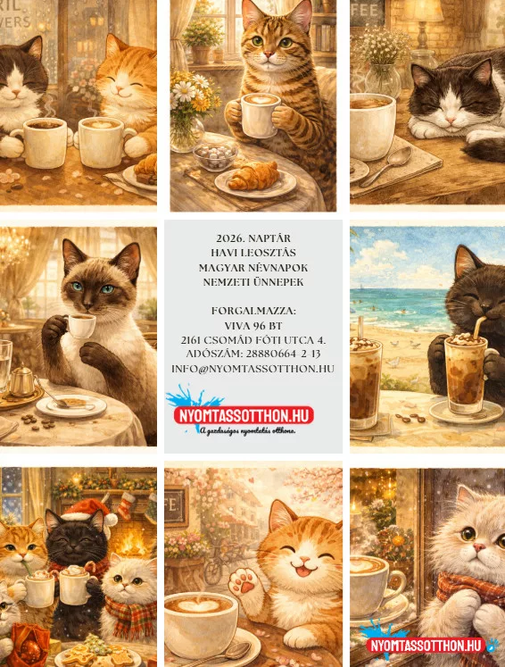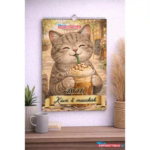 A 2026. Kávé & macskák fali naptár egy kedves hangulatú, szerethető és vizuálisan harmonikus, A4 méretű falinaptár, amely a kávéillatú reggelek és a doromboló nyugalom világát hozza el az év minden hónapjára. A naptár lapjain kedves, festményszerű macskaillusztrációk jelennek meg, kávézók, teraszok és meghitt pillanatok hangulatával – mintha minden kép egy lassú, békés szünetre invitálna.