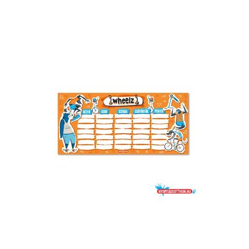 Kétoldalas, magyar nyelvű órarend gördeszkás grafikával alsósoknak és felsősöknek - Méret: 232 x 109 mm.