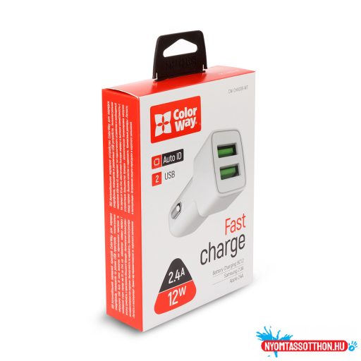 A Colorway 2USB AUTO ID 2.4A (12W) fehér autós töltő egy nagy teljesítményű adapter, amely két USB-porttal rendelkezik, összesen egy/két port 2,4A-ig.