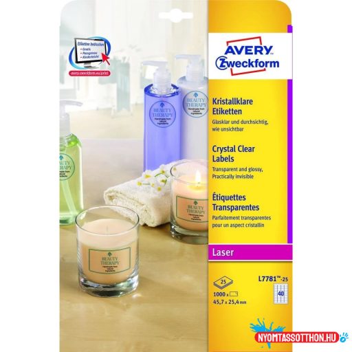 Tökéletes megoldást nyújtanak az üveg, műanyag és fém tárgyak, valamint egyéb fényes felületek felcímkézésére. A címkék olaj-, szennyeződés- és hőállóak (-20°C és +80°C között), cseppállóak és szakadásbiztosak. Tervezze meg és nyomtassa ki címkéit gyorsan és egyszerűen - ingyenes szoftverünkért és sablonjainkért látogasson el a http://www.avery.hu/templates-software/ weboldalra vagy használja a Microsoft® Office csomagokba beépített sablonjainkat! Kifejezetten lézer és színes lézer nyomtatókhoz fejlesztve.