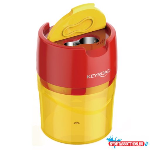 Hegyező 2 lyukú tartályos, fedeles, fém belsővel 12 db/display Keyroad Robby vegyes színek
