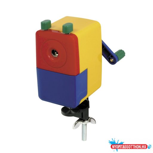 Asztalra rögzíthető hegyezőgép, fém befogóval és hegyező szerkezettel, normál grafit- és színes ceruzák hegyezéséhez.