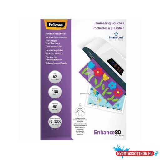 Lamináló fólia, A3, 80 mikron, fényes, 100 db/doboz, Fellowes®