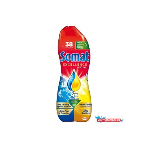 Somat Excellence Duo Gél - a legjobb Somat mosogatógél formulánk, mely hatékonyan tisztít és ragyogó edényeket biztosít, alacsony hőmérsékletű ECO vagy alacsony hőmérsékletű rövid mosogatási programok használata esetén is, melyek során akár 20% energiát is megtakaríthat. Ragyogást és védelmet biztosít a kemény víz okozta foltoktól. Az egyedülálló kétkamrás flakon segítségével a Somat két hatékony formulát egyesít az erőteljes zsíroldóhatás, valamint az odaégett szennyeződések eltávolítása érdekében.
