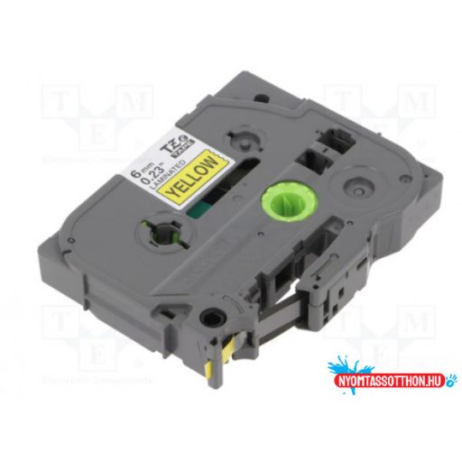 6 mm széles, 8 m hosszú, sárga alapon fekete betűs, öntapadós címkeszalag laminált tartós feliratok nyomtatásához.