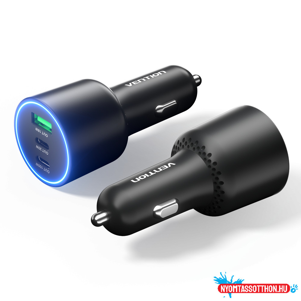 Vention USB-A+C*2 (3port,100/30/18W, fekete,szivargyújtós), töltő