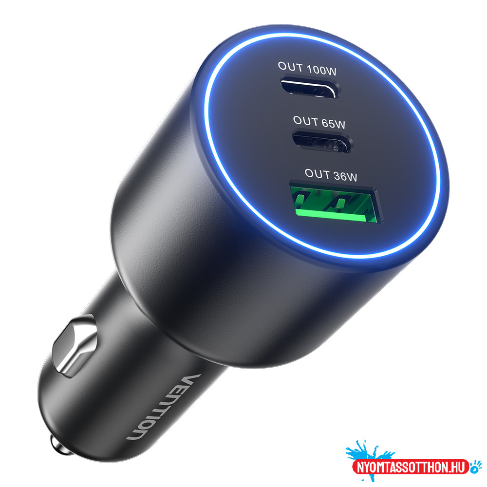 Vention USB-A+C*2 (3port,100/75/36W, fekete,szivargyújtós), töltő