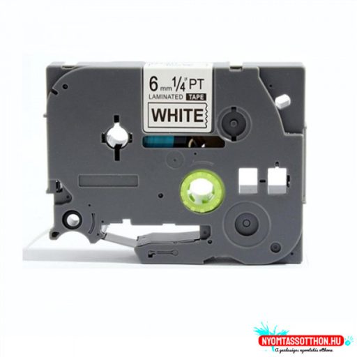 6 mm széles, 8 m hosszú, fehér alapon fekete betűs, öntapadós címkeszalag laminált tartós feliratok nyomtatásához.