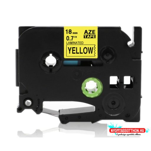 18 mm széles, 8 m hosszú, sárga alapon fekete betűs, öntapadós címkeszalag laminált tartós feliratok nyomtatásához.
