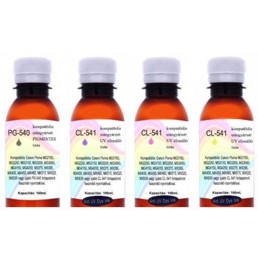 A prémium minőségű CL-541 / PG-540 tinták kifejezetten CL-541 / PG-540 tintapatront használó nyomtatókhoz lettek keverve, tehát a tinta nem univerzális. Ez a kiváló keverés biztosítja a kémiai stabilitást: az éles nyomatokat, a színhű képvilágot. A színek utólagos szoftveres színkalibrációjával nem is kell foglalkozni, mivel élesek és életteliek a nyomatok. 100 ml tintaszett több töltésre is elég, legyen szó tintapatronról vagy külső tintaellátó rendszerről.