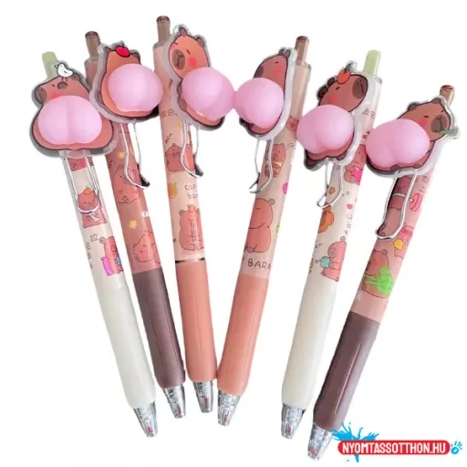 - Díszítés: capybara figura a toll tetején, stresszlevezető nyomkodható popóval